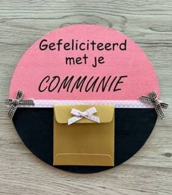 -houten schijfje van 20cm ,handgeschilderd en versierd , met een envelopje waar je jouw briefjes in kan steken